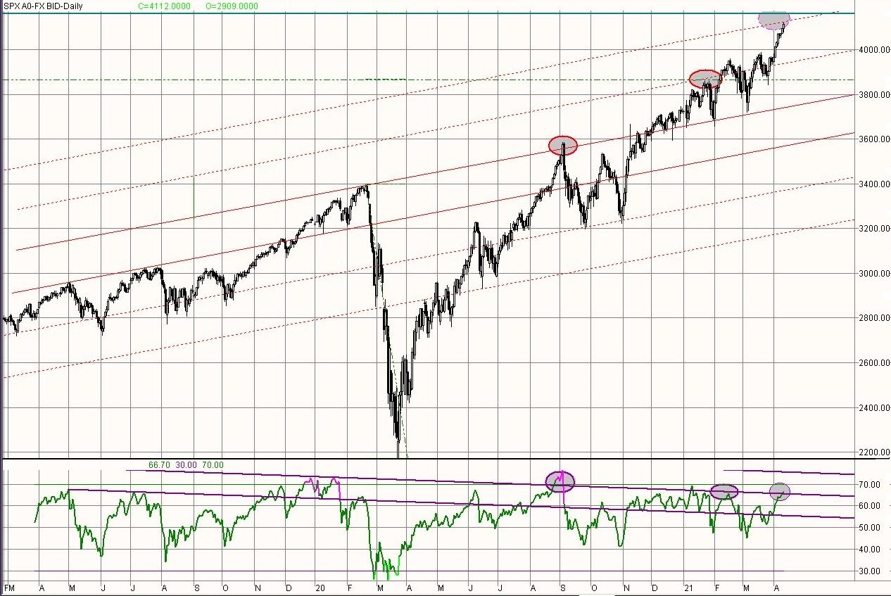 Часто от трейдеров (в том числе от трейдеров, приписывающих себе огромный опыт) можно слышать следующие утверждения - если переписаны исторические максимумы, то далее космос, оценить следующий уровень, к которому прийдёт цена актива, с помощью технического анализа невозможно. Утверждения абсолютно неверные, а их авторы выдают, что в тех-анализе далее рисования горизонтальных линий они не продвинулись. Те же, кто в курсе существования каналов тренда, рисуют новую линию сопротивления канала на расстоянии ширины канала от преждней линии сопротивления (превратившейся в линию поддержки). Достижение новой линии сопротивления как раз и станет оценкой следующего уровня цены актива. Как видно из приведённого выше графика SPX, эта логика хорошо отработала оба раза после обвала рынков в марте 2020 года, когда курс SPX после переписывания исторических максимумов приходил в район новой линии сопротивления канала. И как видно из графика, в конце прошлой недели мы снова оказались вблизи уровней, от которых можно ждать разворот. На графике RSI все эти 3 точки и вовсе потенциально укладываются на общей нисходящей линии, поэтому можно говорить о наличии сильной дивергенции (но уповать исключительно на дивергенцию не следует). И исходя из этой картины можно сделать следующий прогноз: в ближайшие 2-3 недели начнётся вторая фаза обвала финансовых рынков, её индикатором станет достижение курсом SPX диапазона 4150 - 4175 пунктов. Тут можно резонно заметить - а почему отскок от 4150 (если он состоится) будет началом именно обвала? Может SPX в течение мая-июня ограничится коррекцией в 400-500 пунктов, и на этом всё закончится? Это замечание правильное - я 10 апреля не обладаю после-знанием, потому у моего прогноза нет абсолютных гарантий и он вполне может оказаться ошибочным. Всё определит реальное развитие событий - если курс SPX до конца апреля либо уйдёт сильно выше 4200, либо отскок от 4150 ограничиться коррекцией и не перейдёт в обвал, я признаю данный прогноз ошибкой и буду искать новые уровни разворота и отсечки времени, с которых может начаться вторая фаза обвала финансовых рынков. Главное - не пополнить ряды "армагедонщиков" (их имена всем известны), которые уже более 5 лет (а некоторые - около 10 лет) поют песню "всё когда-то рухнет, но когда - я не знаю". Как только на рынках намечался обвал, они с надутыми щеками начинали раздавать многочисленные интервью: "Я же говорил!" Но как только ситуация разворачивалась, они испарялись, снова включая режим "всё равно всё рухнет, подождите ещё квартал/годик/несколько лет". Да, рухнет; но цена "я-же-говорилам" уже равна нулю, поскольку эти клоуны промахнулись со своими прогнозами "всего" на 10 лет.